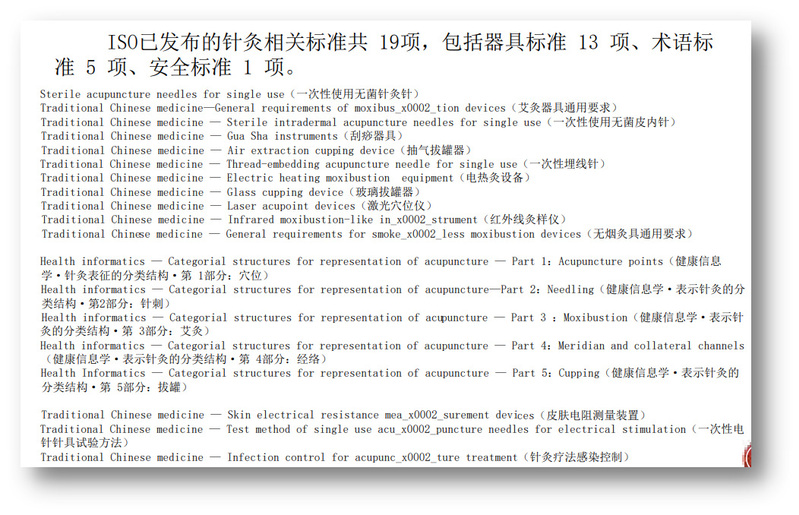 ISO已发布的针灸相关标准共19项,包括器具标准13项、术语标准5项、安全1项。其中,最具影响力的一项就是“一次性使用无菌针灸针”,今年正是该标准发布的第十年。目前,针灸在世界190多个国家得到广泛传播和应用,都得益于一次性无菌针灸针国际标准的制定。