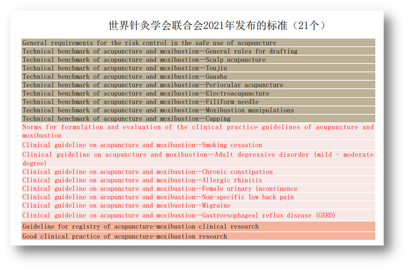 WAFS在2013年发布了第一批针灸相关标准,包括针灸针、穴位、耳穴、艾灸4项标准。至2021年集中发布了第二批、第三批标准,共计有21项标准。除外一些技术操作规范标准,其中涉及了较多针灸治疗优势病种的临床实践指南。