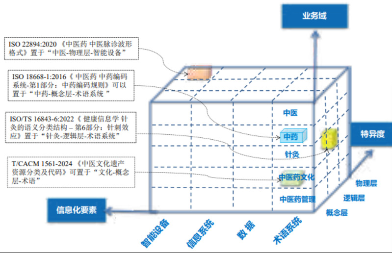 健康信息学-中医药信息标准体系框架与分类(ISO 18790-1)是首项中医药信息标准。该标准是对中医药信息标准开发与管理的顶层设计,提出了中医药信息标准体系的三维描述框架:业务域、信息化要素和特异度。
